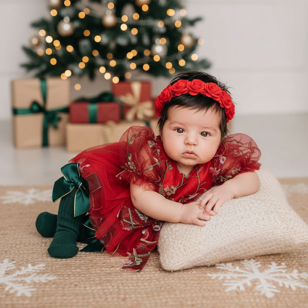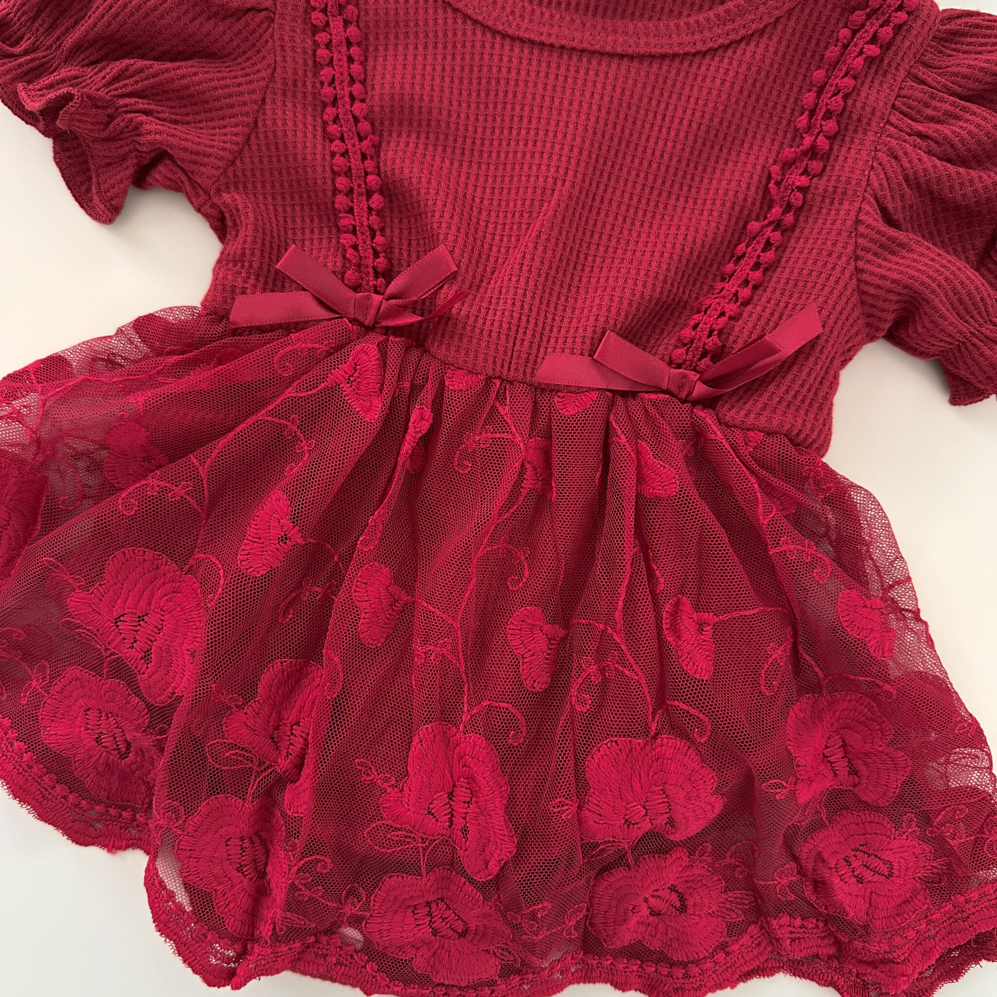 – Espectacular vestido body color rojo bordados y moños en cinta que le da un toque de elegancia. Perfecto para que tu bebé luzca hermosa esta temporada.